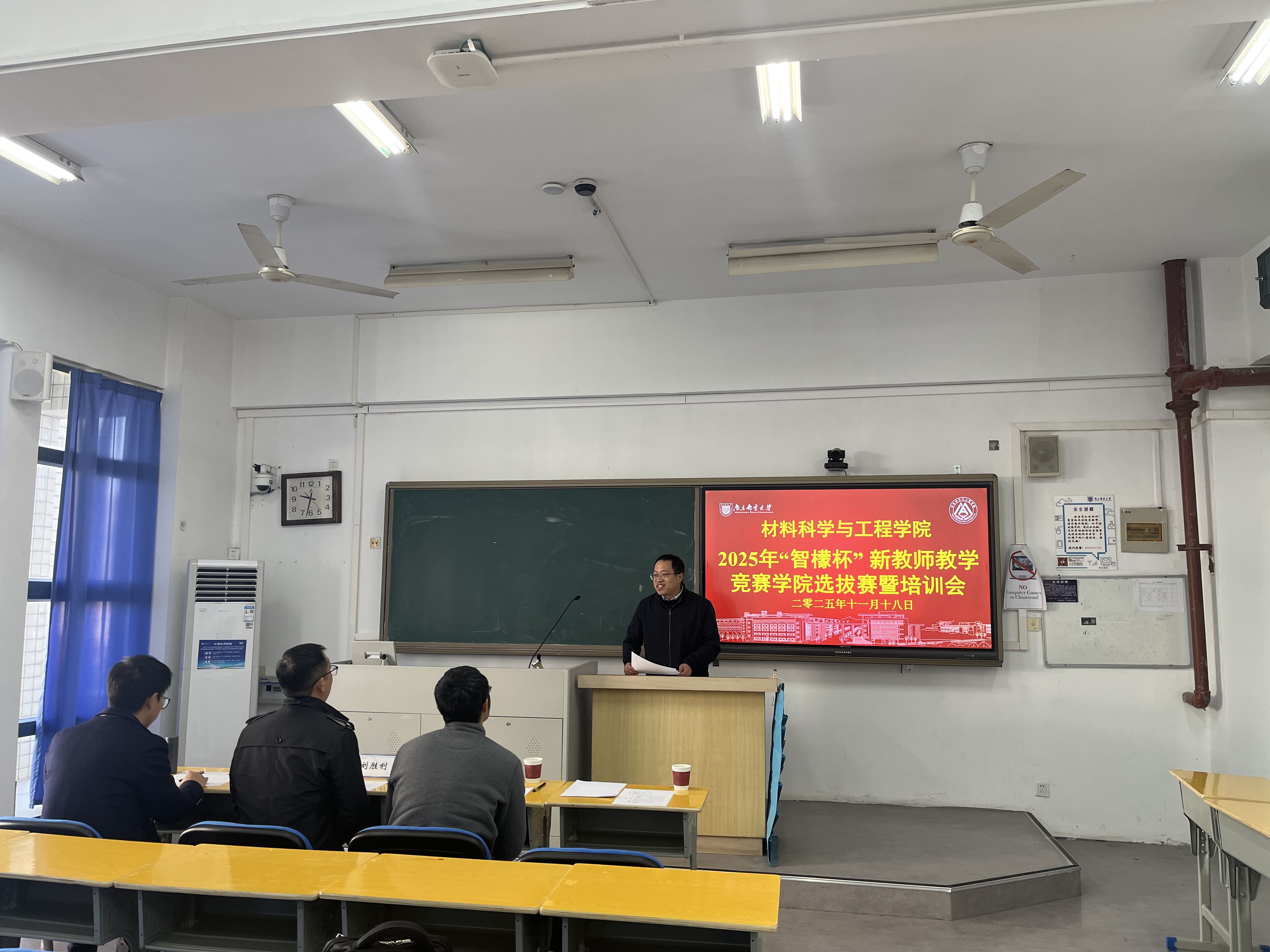 为进一步加强新教师培养工作,扎实锤炼新教师教学基本功,充分激励新教师积极投身教学实践,全面促进其教学能力与专业素养提升,11月18日上午,材料科学与工程学院在仙林校区教1-110教室成功举办2025年“智檬杯”新教师教学竞赛学院选拔赛暨培训会。本科生院未来教师发展中心主任刘胜利教授、自动化学院赵勃教授和化学与生命科学学院刘绪副教授受邀担任本次竞赛的评审专家。活动由材料科学与工程学院副院长宋春元教授主持,学院导师制在培教师到场观摩学习。
