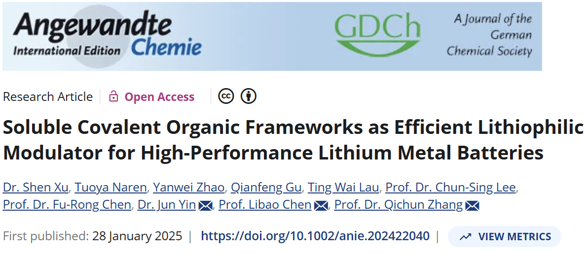 近日,南京邮电大学材料科学与工程学院、柔性电子全国重点实验室徐申教授团队在可溶多功能共价有机框架领域取得了最新研究进展,相关成果以“Soluble Covalent Organic Frameworks as Efficient Lithiophilic Modulator for High-Performance Lithium Metal Batteries”为题发表在国际学术期刊Angewandte Chemie International Edition(《德国应用化学》)上。重点实验室徐申教授、中南大学博士生娜仁托雅为论文共同第一作者,香港城市大学张其春教授、陈福荣教授、中南大学陈立宝教授、香港理工大学殷俊助理教授为论文共同通讯作者。