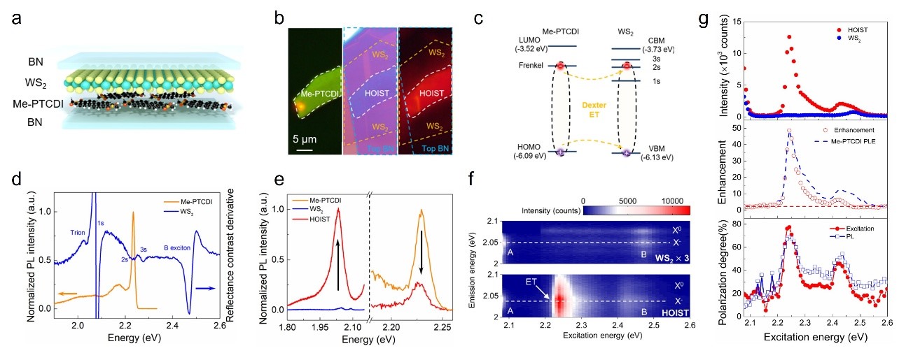 近年来,二维半导体材料(如过渡金属硫族化合物)因其独特的光电性质和可调的电子结构受到广泛重视,但其原子级厚度导致的本征光吸收率低,严重限制了实际应用。传统的光吸收增强方法往往以牺牲响应速度为代价。在此背景下,能量转移(ET)作为一种通过激子形式实现的非辐射能量传递机制,理论上可在不引起电荷转移的前提下有效增强光吸收。然而,该过程常与超快电荷转移相互竞争,并且严格依赖于材料间的能级匹配和波函数重叠,因此在二维异质结构中实现纯净、高效的ET仍存在显著挑战。针对上述难题,研究团队成功构建了以Me-PTCDI为供体、WS2为受体的新型二维有机/无机杂化异质结构。该结构充分利用有机分子在分子水平上的化学可调性与局域Frenkel激子所具有的强振子强度和高荧光量子产率等优势,通过精确匹配供体Frenkel激子与WS2的2s暗激子能级,借助Dexter电子交换机制实现了高效共振能量转移。实验结果显示(图1),异质结中WS2的光致发光强度最高增强达到124倍,且具有偏振特性,创下了同类报道的最高记录。理论计算进一步表明,得益于减小的层间距和受体2s激子态的空间离域特性,其ET速率较传统无机异质结构提升了一个数量级。