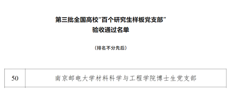 近日,教育部思想政治工作司公布了第三批全国高校“百个研究生样板党支部”和“百名研究生党员标兵”创建培育工作验收通过名单。通过创建培育,经高校评估总结、省级党委教育工作部门把关审核、教育部学位与研究生教育发展中心审查及相关司局综合评定,认定南京邮电大学材料科学与工程学院博士生党支部通过第三批全国高校“百个研究生样板党支部”创建培育验收。
