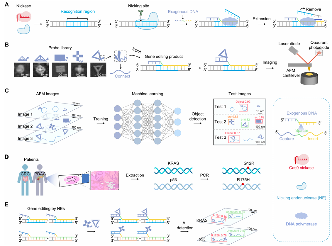 科研团队通过多技术融合实现高效精准检测,首先利用核酸酶作为“分子剪刀”在目标DNA特定位点产生单链断裂,避免脱靶风险。其次,基于DNA纳米探针(DNA四面体及三角形、十字形、矩形DNA折纸)实现位点特异性标记并利用AFM提供纳米级成像。最后,引入YOLOv5l算法实现AFM图像中目标物体的自动化识别与分类,大幅提升数据处理效率。