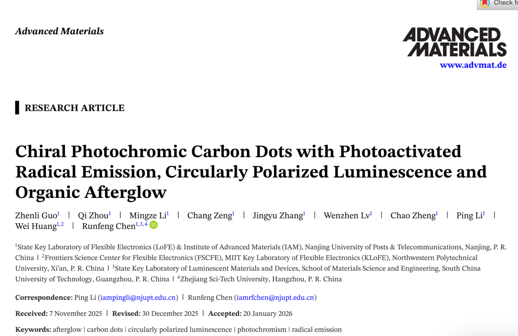 《先进材料》刊发柔性电子全国重点实验室黄维院士、陈润锋教授团队在自由基手性碳点长余辉领域的研究进展
