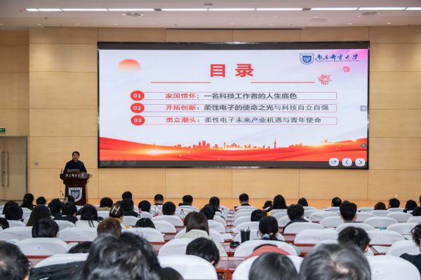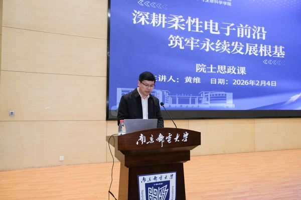 2026年2月4日,一场兼具思想高度、学术深度与时代温度的院士思政课,在南京邮电大学“运满满”报告厅隆重开讲。中国科学院院士、柔性电子全国重点实验室主任、南邮IAM学科带头人黄维院士以“深耕柔性电子前沿,筑牢永续发展根基”为题,给IAM团队师生带来了一场立足科技前沿、紧扣国家战略、贯通初心使命的精彩报告。本次活动由校党委常委、副校长肖甫教授主持,材料科学与工程学院、化学与生命科学学院党政领导班子、全体教师及学生代表共同聆听了这场思想与学术的盛宴。