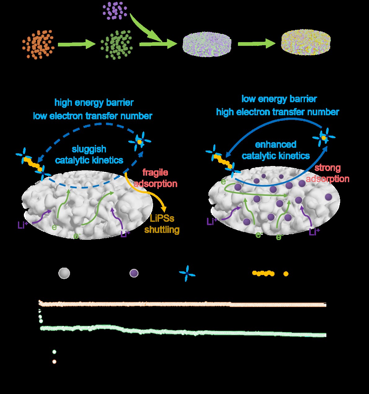 基于此,团队通过对VN和B2O3功能性纳米颗粒进行烧结-扩散,成功构建了一种具有连续骨架和分级多孔网络的一体化蚁巢状硫主体。在该一体化结构中,VN纳米单元作为高活性催化中心,而互联的多孔陶瓷基体则有效克服了传统颗粒膜的固有缺陷,如界面电阻高、孔隙率过大以及非活性组分占比过高等问题。连续的导电骨架为电子提供了高效传输路径,同时多孔结构保障了快速的离子扩散通道。此外,VN/B2O3(VNBO)异质界面增强了对多硫化物的化学锚定作用,实现了物理限域与化学吸附的双重协同。更为重要的是,VNBO异质界面实现了“电子-催化协同调控”机制。B2O3的引入有效调控了VN/B2O3异质界面的电子结构,降低了反应能垒,增加了电子转移数,从而显著加速了多硫化物的氧化还原动力学。通过耦合电子-催化调控与一体化多孔基体的结构设计,研究团队同步提升了硫的利用率和负载量,成功构筑了基于VNBO陶瓷的高能量密度硫正极。实验结果表明,所制得的一体化2-VNBO@S正极在1 mg cm⁻2的硫负载量下,0.5 C循环200次后仍能保持1187.2 mAh g⁻1的高放电容量。即使在3 C高倍率下,循环300次后容量仍能保持在944.3 mAh g⁻1,每圈容量衰减率低至0.054%。在更接近实际应用条件的4 mg cm⁻2硫负载量下,0.5 C循环150次后,放电容量仍稳定在557.9 mAh g⁻1。结合系统的电催化分析和理论计算,研究结果充分揭示了VN纳米单元、B2O3组分以及一体化结构之间的强协同作用。该研究为开发面向锂硫电池的高能量密度、长循环寿命的硫正极提供了一条具有前景的新路径(图1)。